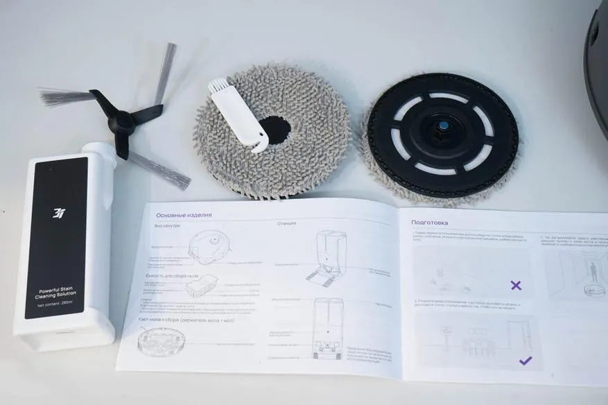 Поставляется робот в большой упаковке, внутри в дополнительных коробках находятся: сам робот, тарелки-мопы с салфетками, щеточка для чистки, боковая щеточка, мыло для робота (моющее средство), инструкция для пользователя, сетевой кабель. И конечно же — большая станция самоочистки с двумя контейнерами, подиумом и съемным поддоном. Перед использованием потребуется установить на робота боковую щеточку, привязать робота к приложению и заправить баки чистой водой.