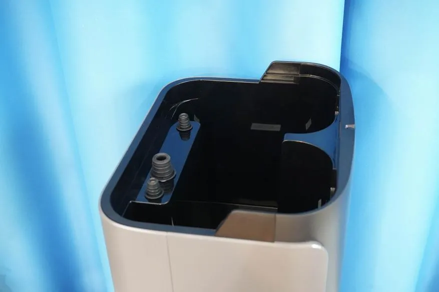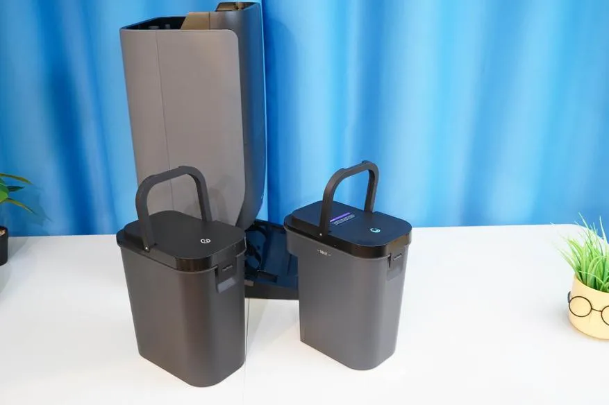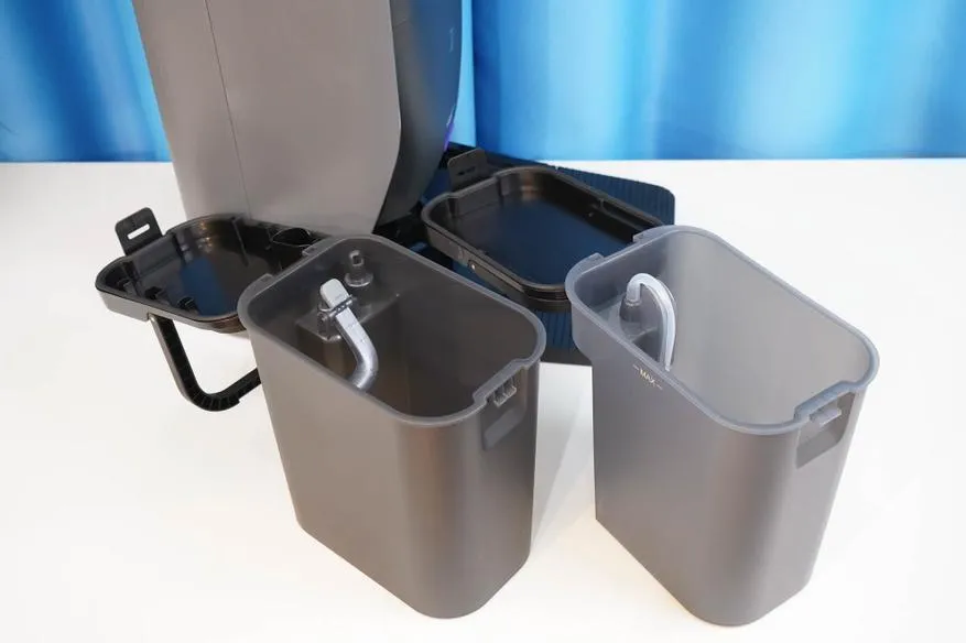 Как я уже выше сказал, оба контейнера довольно вместительные. Оснащаются датчиками уровня, в частности, на корпусе резервуара для чистой воды имеется метка Max — выше этого уровне не стоит заливать. Для удобства контейнеры оснащается ручками, а подключение осуществляется с помощью специальных штуцеров с уплотнением.