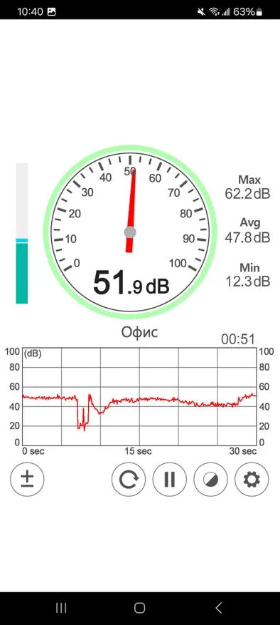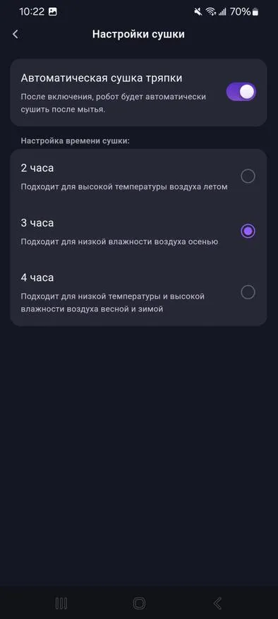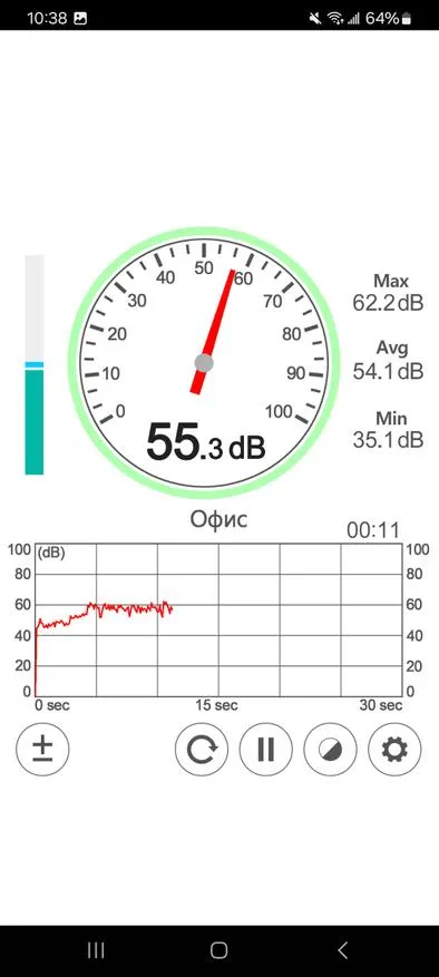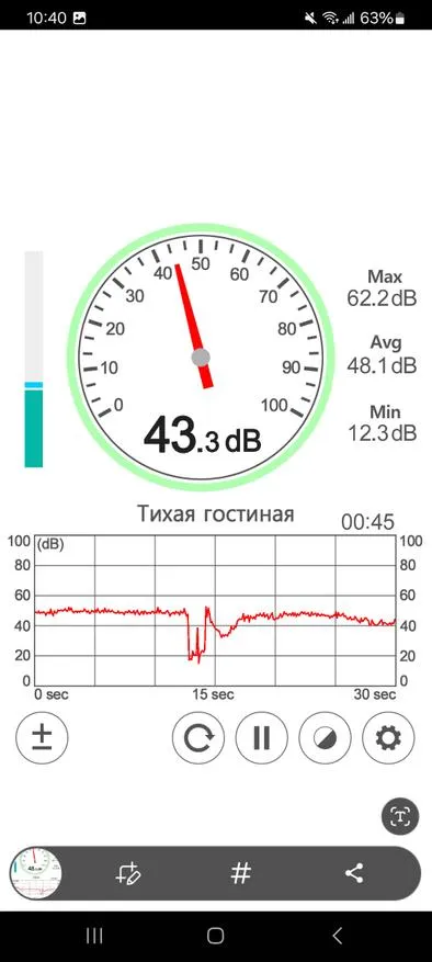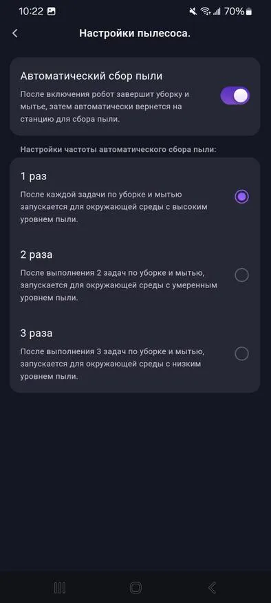 Попробовал оценить уровень шума при работе робота. Примерно, с помощью встроенного в смартфон микрофона и приложения, с расстояния около метра. При сухой уборке с максимальным всасыванием робот шумит на 50-52 дБ. При умеренном всасывании и влажной/сухой уборке шум заметно ниже — около 42-43 дБ. А вот при самоочистке опять шумно — аж 55 дБ. Если стараетесь убирать с минимальным шумом — выставляйте настройки всасывания чуть меньше максимальных, а в приложении в разделе настроек станции можно убрать обязательную самоочистку. В таком случае очистить мусор можно будет по отдельной команде из приложения.