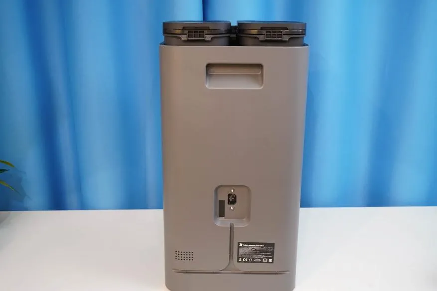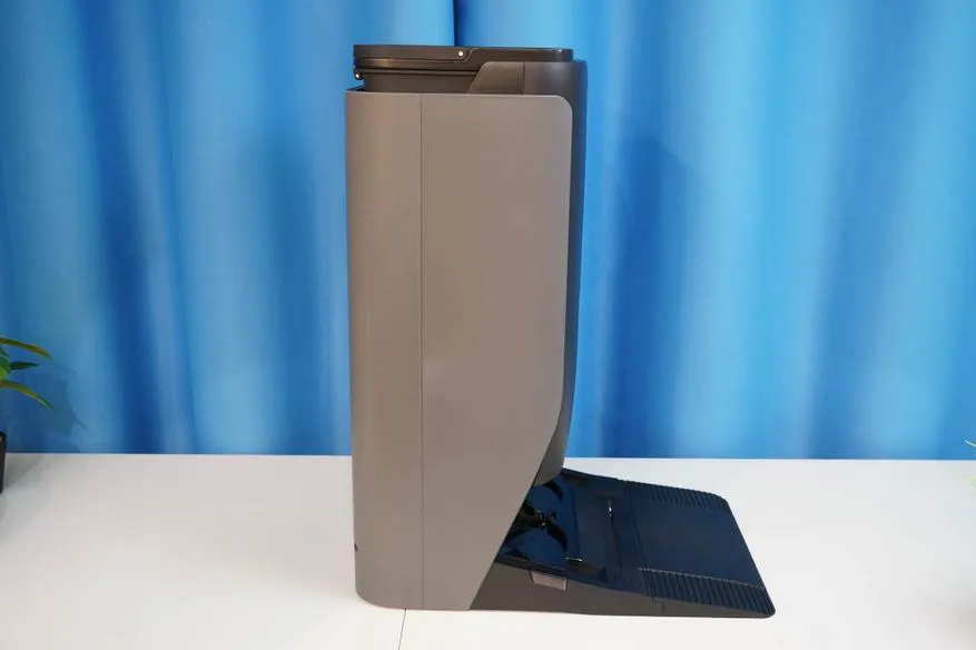Пара слов про станцию самоочистки из комплекта P10 Ultra. Это крупная, вытянутая вверх станция, с двумя большими контейнерами (около 3 литров по вместимости, каждый), с мешком для сбора пыли. На задней стороне сделан органайзер, позволяющий спрятать лишнюю длину сетевого провода. Спереди предусмотрен подиум для заезда робота. Есть индикация состояния, отсек для мыла и так далее. Размер в высоту чуть больше полуметра (59 сантиметров), ширина 46 см с учетом подиума и глубина чуть больше 30 см. Есть ограничения по размещению — не ближе полуметра к углам, и не менее полутора метров свободное пространство перед базой для заезда робота.