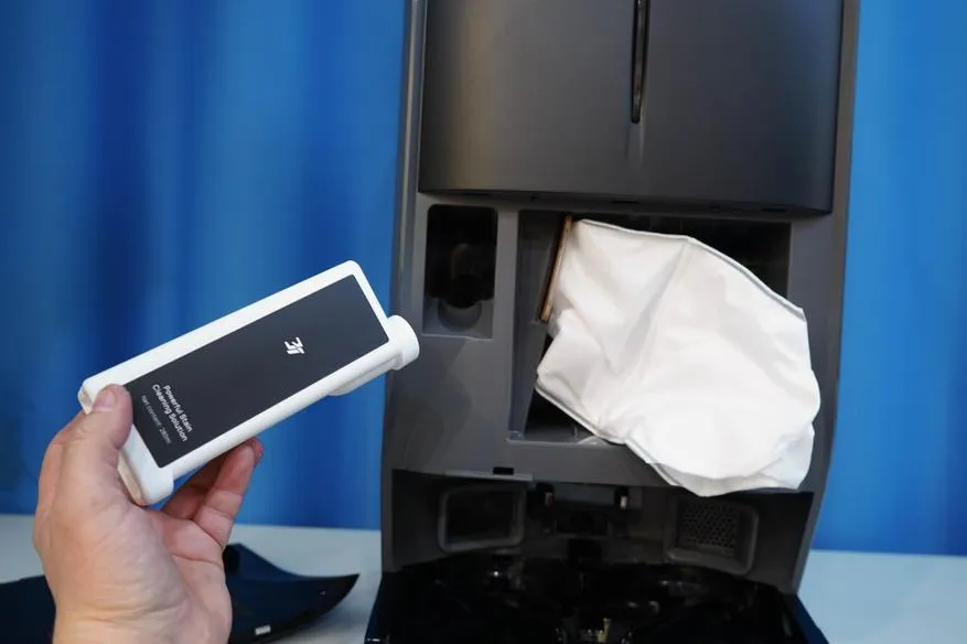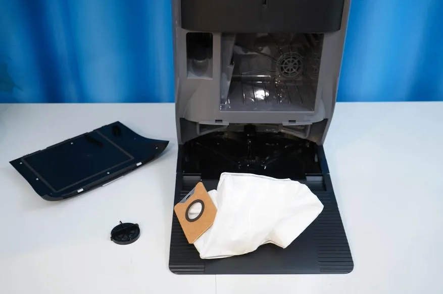 В нижней части корпуса, на передней панели, предусмотрена съемная фальш-крышка. Под ней скрывается мешок для мусора (сменный, периодичность замены примерно месяц-два). Есть и моторный фильтр — не потеряйте эту сеточку. Она может забиваться пылью в том случае, если мешок неправильно (неплотно или не до конца) установлен в пазы крепления, или же переполнен. Далее, слева от мешка можно найти слот для подключения бутылочки с моющим средством. Подключение хитрое — методом прокола корпуса. Расходуется мыло постепенно, добавляется при влажной уборке по чуть-чуть.