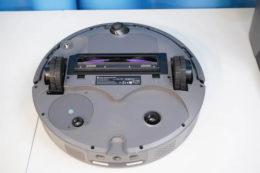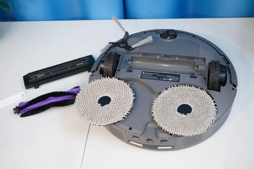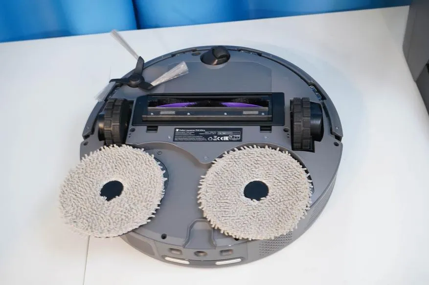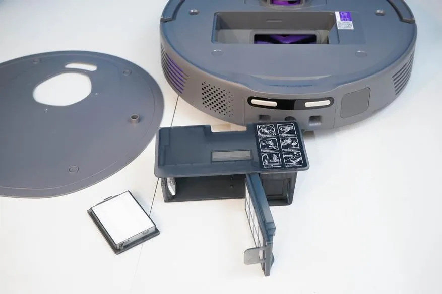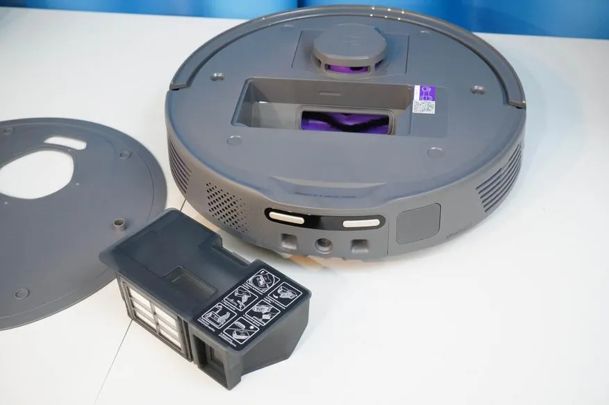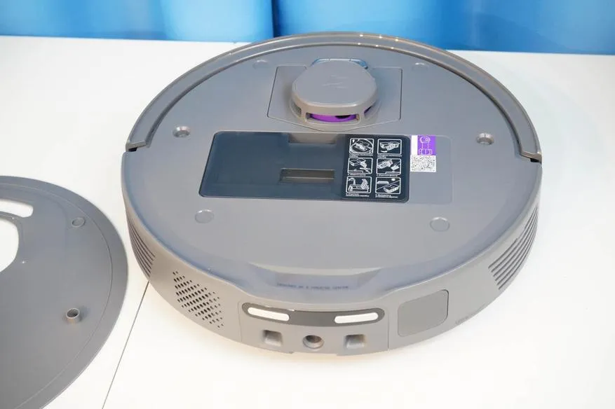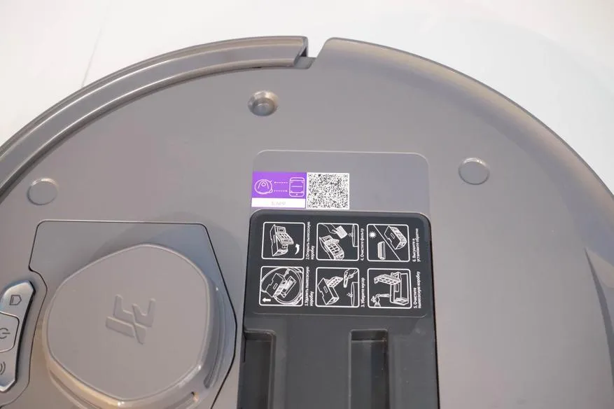Верхняя крышка сделана отдельной деталью и является полностью съемной. Под крышкой располагается контейнер с фильтром (его можно извлечь, но очищается от мусора он в автоматическом режиме на станции). Обращаю внимание на стикер с QR-кодом для подключения (понадобится на этапе привязки к приложению 3i), краткая инструкция по уходу, а также кнопка аппаратного сброса. На нижней стороне робота имеются оптические сенсоры (датчики края — для избегания падения с лестницы), УЗ-датчик ковра, тарелки с мопами (две штуки), одна боковая щеточка, центральный ролик.