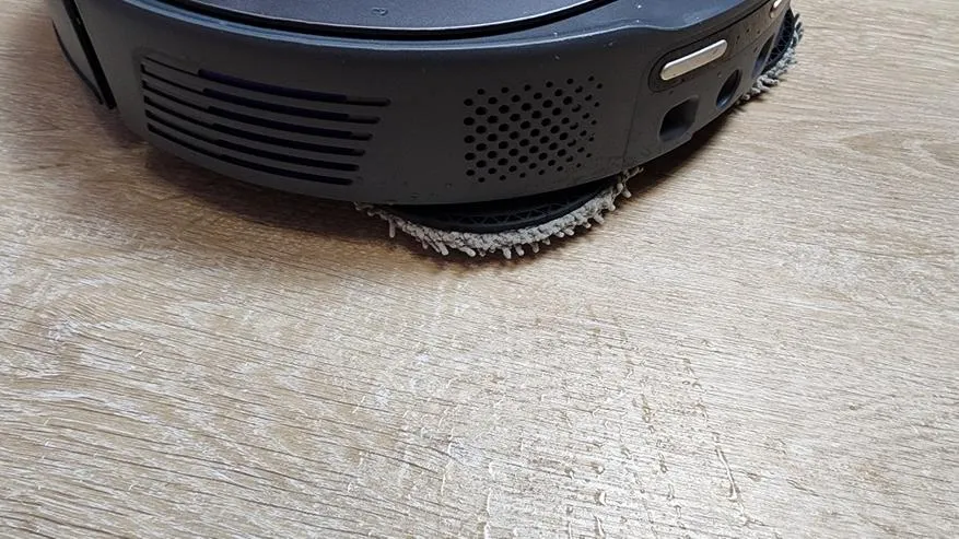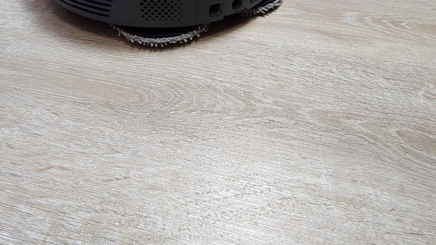 Уровень дозирования воды на салфетки можно выбрать в приложении. Для плитки высокое смачивание не критично, а для ламината может быть многовато — делайте средний или минимальный уровень. На фотографиях ниже пример влажной уборки — ламинат остается едва влажный, практически сразу просыхает, а сами полы остаются чистыми (проверял чистой салфеткой после робота).