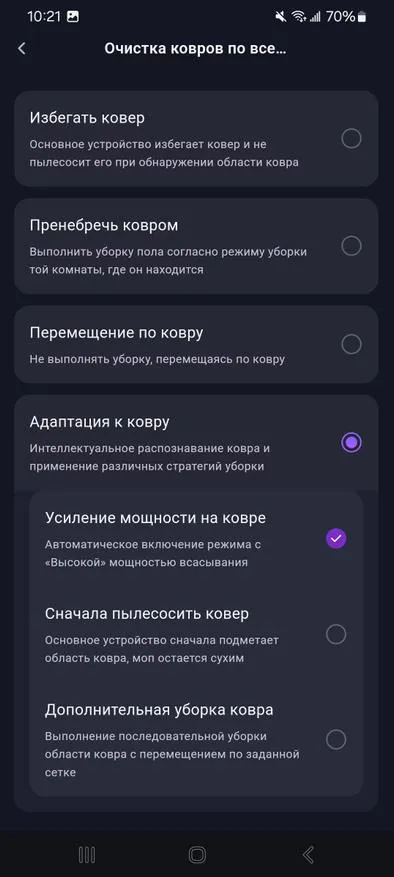 У меня на цветном ковре проблем с распознаванием нет — увеличивает в автомате силу всасывания. За ковры, к слову, в приложении отвечает отдельная настройка — можно отключить распознавание. Зато шерсть с ковров собирает отменно.