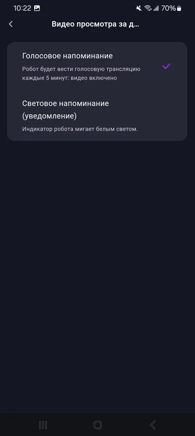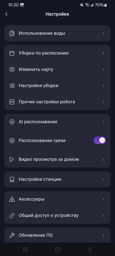 В плане нареканий к самой уборке нет — я обычно настраиваю совмещенную уборку, когда сначала протирается/пылесосится периметр, затем убирается остальная площадь. Робот сам катается по алгоритму, если сядет батарея — то после подзарядки продолжит с места остановки. Камера помогает распознавать брошенные предметы, препятствия, крупный мусор. В настройках, кстати, есть вариант, когда во время работы камеры идет голосовое оповещение.