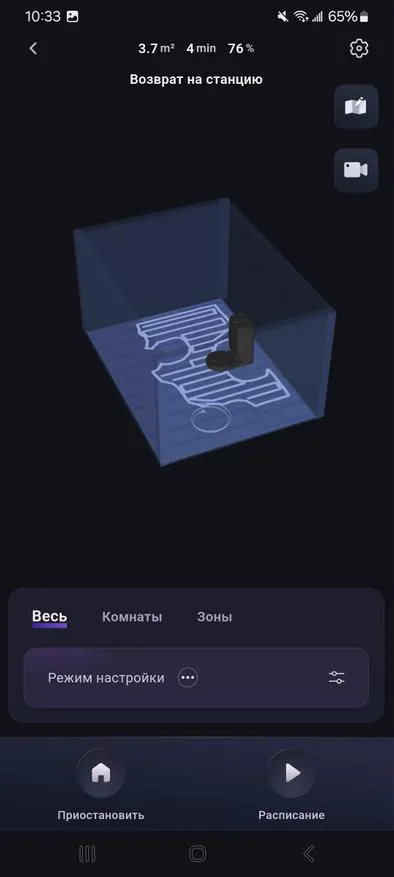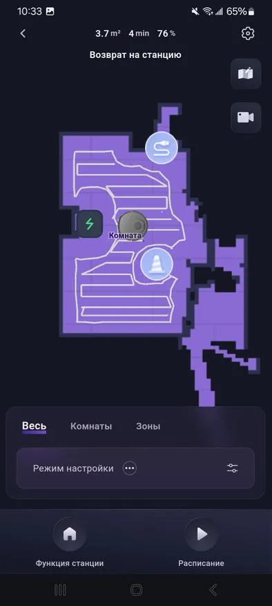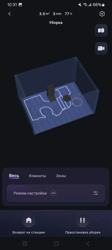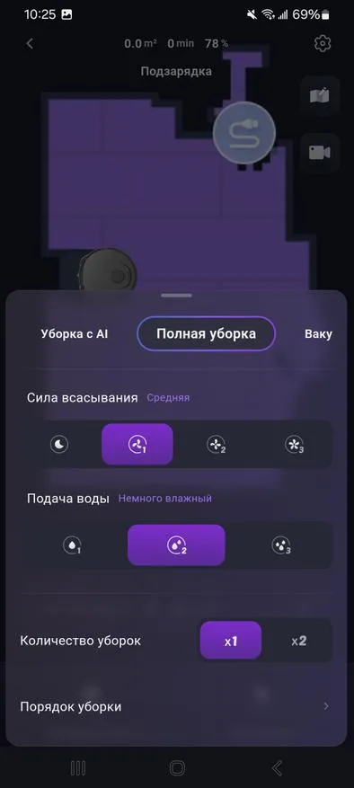 Установил робота в комнате, создал и сохранил карту. Обновил до актуальной версии прошивки, заодно и зарядил до 100 процентов батарею. Далее, перехожу к тестовой уборке. Выбираю настройку совмещенная уборка, уровень всасывания — средний, уровень смачивания мопов — средний.