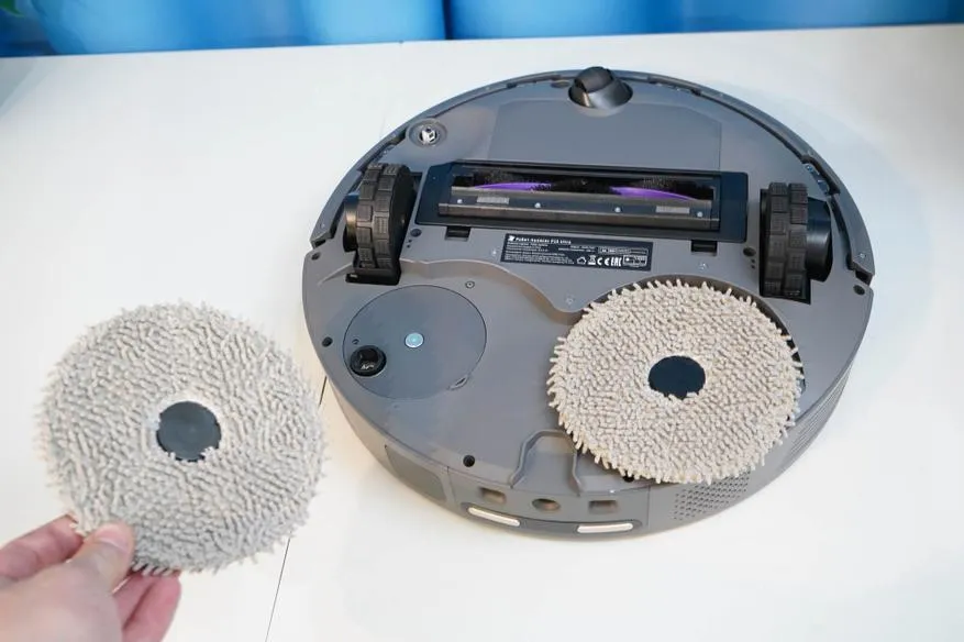 В плане конструкции робота все сделано традиционно удобно для обслуживания. Тарелки с мопами на магнитах, сами салфетки на липучке. Снять-поменять минутное дело. Одна тарелка, кстати, имеет подвижный эксцентрик с сервоприводом, то есть умеет выдвигаться за пределы корпуса для более тщательной уборки, например, по краю помещения. Центральный ролик можно извлечь, обращаю внимание на специфический профиль резинок на ролике — это сделано для срезания волос при заезде на станцию. Если волос много и станция не справилась — можно воспользоваться специальным инструментом из комплекта, у которого имеется дополнительный резак для волос/шерсти. Ну или ниток — такое тоже случалось за время использования роботов.