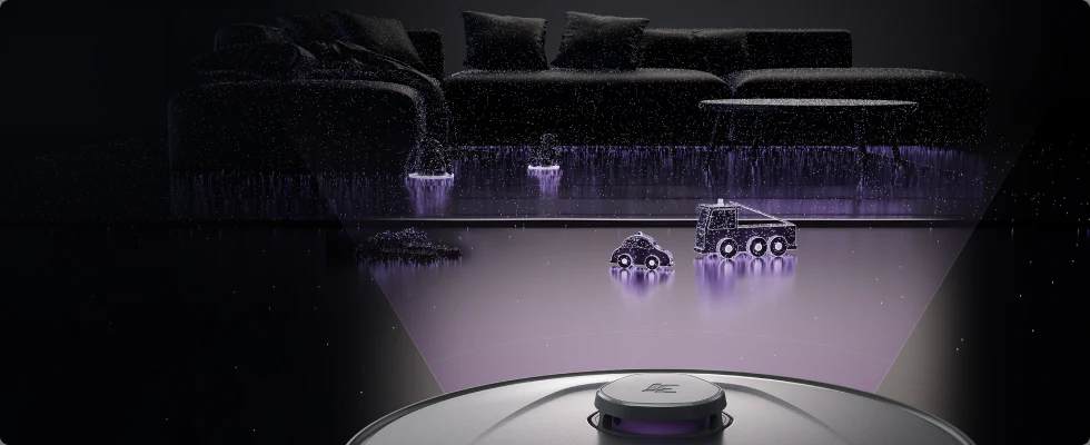 Распознает типы загрязнений и освещает темные участки, чтобы обеспечить эффективную и целенаправленную уборку.